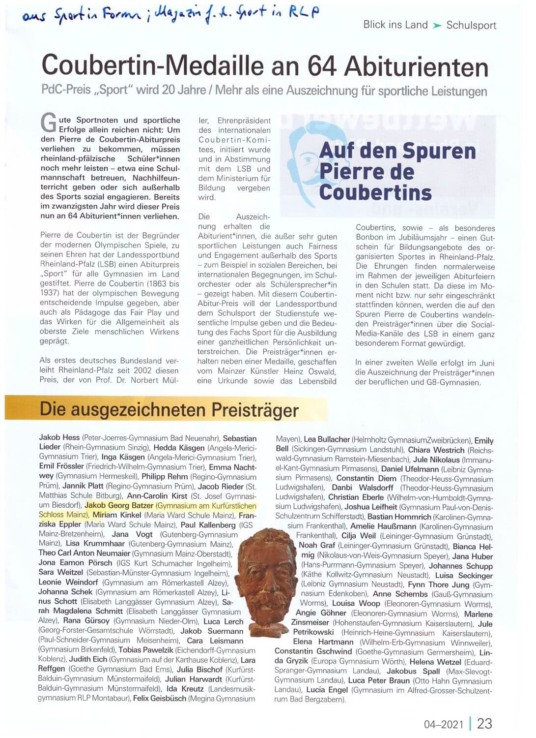 In diesem Jahr erhielten 64 Abiturienten:innen des Landes Rheinland-Pfalz den Abiturpreis Pierre de Coubertin, welcher bereits im zwanzigsten Jahr verliehen wird.