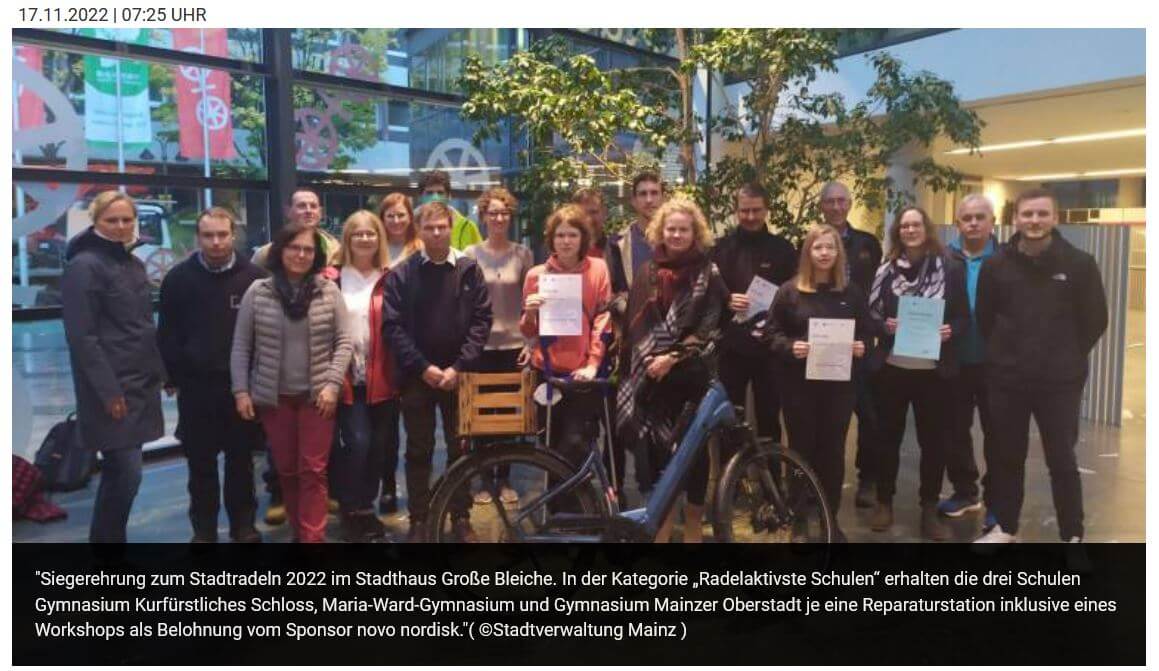Beim Stadtradeln 2022 haben die Mainzerinnen und Mainzer mehr als 312.000 Kilometer erradelt. So lautet das Ergebnis der 11. Kampagne. Insgesamt rund 2.200 Radelnde haben in die Pedale getreten. Auch die Mainzer Schulen sind im Rahmen der Sonderkategorie „Schulradeln“ mit geradelt. 15 weiterführende Schulen haben fast 76.000 Radkilometer gesammelt. Dabei belegte das Gymnasium am Kurfürstlichen Schloss den ersten Platz als „Radelaktivstes Team“ und auch als „Größtes Team“. In der Kategorie „Team mit den radelaktivsten Teilnehmenden“ belegten das Team „Free for all“, bestehend aus zwei Radelnden, mit rund 2.300 zurückgelegten Kilometern den ersten Platz.
