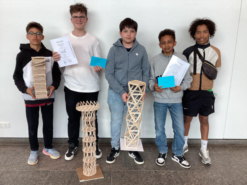‚Baue einen Turm mit Aussichtsplattform!‘ hieß die diesjährige Aufgabe beim Wettbewerb der Ingenieurkammer Rheinland-Pfalz. Es wurden insgesamt 190 Modelle eingereicht, und Jan Heißler sowie Paul Sänger und David Fischer aus der 7c belegten jeweils einen tollen 4. Platz in der Alterskategorie bis 8. Klasse. Sie bekamen ein Spiel, eine Urkunde und ein Preisgeld von 50 Euro!