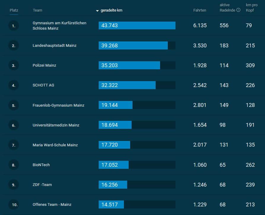 Danach wurde die Statistik jedoch trotzdem nochmal geändert mit dem Ergebnis, dass der Account „Landeshauptstadt Mainz“ inzwischen 236 aktiv Radelnde aufweist mit einer Gesamtstrecke von 53.766 km und somit plötzlich eine um rund 10.000 km längere Strecke hat als wir.