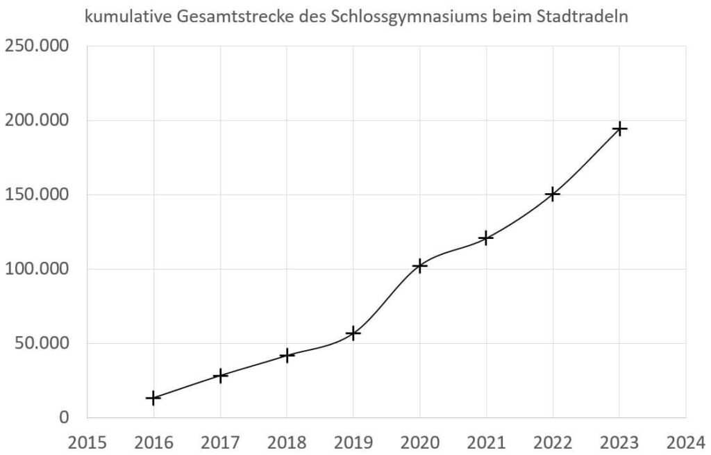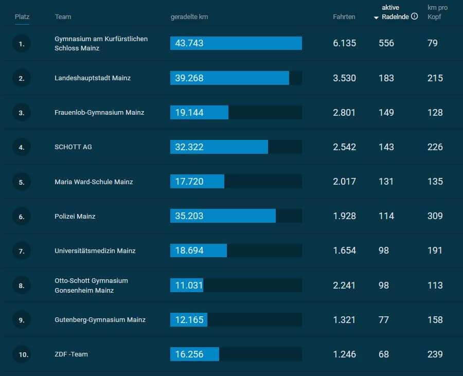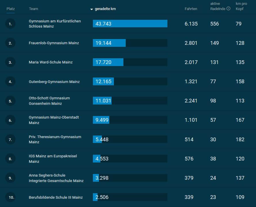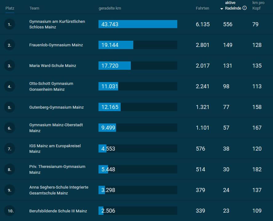 Alle Teams zusammen in der Stadt Mainz bestehen aus 3.042 aktive Radelnde, die insgesamt 543.924 km zusammengetragen haben. Damit hat das Schlossgymnasium mehr als 18% der Teilnehmenden in der Stadt Mainz gestellt und wir haben 8% der Gesamtstrecke beigetragen.