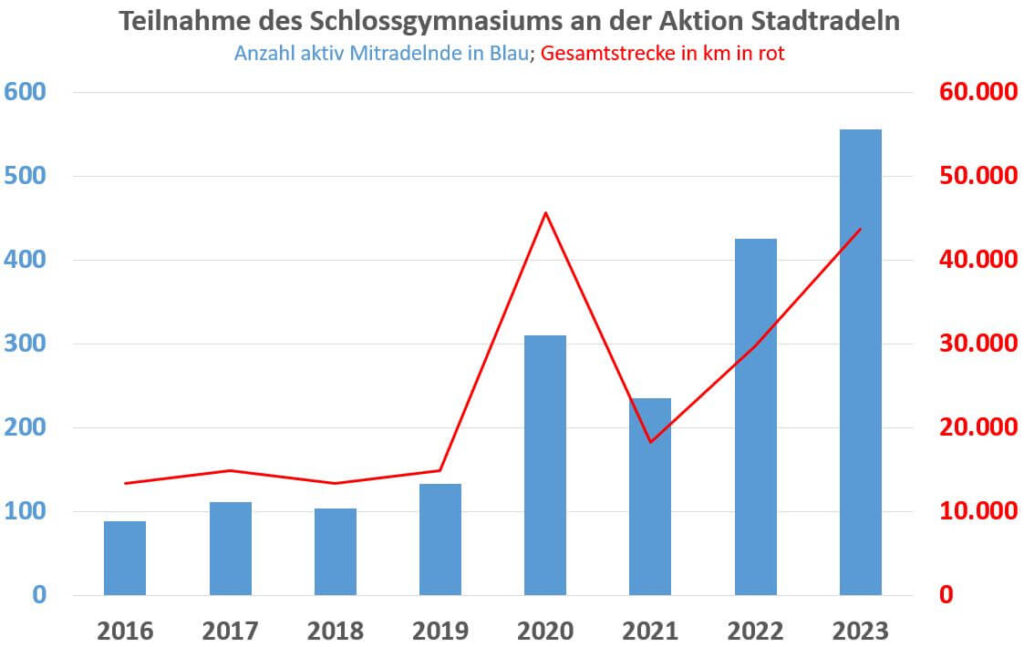 Bei der Teamgröße lagen wir früh vorne und konnten den Abstand kontinuierlich ausbauen. Mit am Ende 556 aktiv Radelnden haben wir mehr Teilnehmerinnen und Teilnehmer als die Teams auf Platz 2 bis 4 zusammen, wo die Teams der Stadtverwaltung, des Frauenlobgymnasiums und der Schott AG sich einreihten. Unsere bislang höchste Teilnehmerzahl beim Stadt- und Schulradeln ist insbesondere das Verdienst von Herrn Seimetz, der unermüdlich alle Klassen und Kurse persönlich besuchte und auf diese Art und Weise Teilnehmerinnen und Teilnehmer mit ihren Strecken eingesammelt hat. Gleichzeitig haben auch viele die Abgabe über das Aufgabenmodul unserer Plattform IServ genutzt, was sich seit dem Fernunterricht etabliert hat. Auch konnten wir einige Eltern mehr als in den vergangenen Jahren für unser Team aktivieren. Bei der letzten Ausgabe des Stadtradelns hatten wir für uns überraschend eine Fahrradreparaturstation gewonnen, diese wurde im Laufe des aktuellen Stadtradelns im Hof installiert und eingeweiht. Dies hat sicher auch noch einen Schub bei der Teilnehmerzahl gebracht. Nochmals herzlichen Dank dafür an die Stadt Mainz und den Sponsor Novo Nordisk.