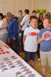 Dann sind wir in unsere zugeteilten Räume und dann in die Aula gegangen. Dort haben wir zuerst getanzt. In der Aula bekamen wir Zettel ausgeteilt. Dann wussten wir, in welcher Reihenfolge wir die Spielstationen durchlaufen durften und wann wir mit dem Essen am Buffet dran waren. Jede Klasse hatte etwas für dieses Buffet mitgebracht. Drei Mädchen aus einer siebten Klasse halfen den Tutoren beim Buffet in der Mensa. Sie heißen Amal, Vanessa und Günay. Sie halfen sogar beim Aufräumen. Das war nett.