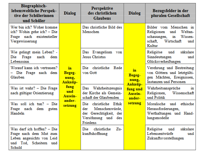 Die Inhalte des Religionsunterrichts ergeben sich aus der Verschränkung des christlichen Glaubens mit der biographischen Perspektive der Schülerinnen und Schüler und den komplexen Fragen, die sich angesichts eines Lebens in einer globalisierten und pluralen Welt und Gesellschaft stellen:
